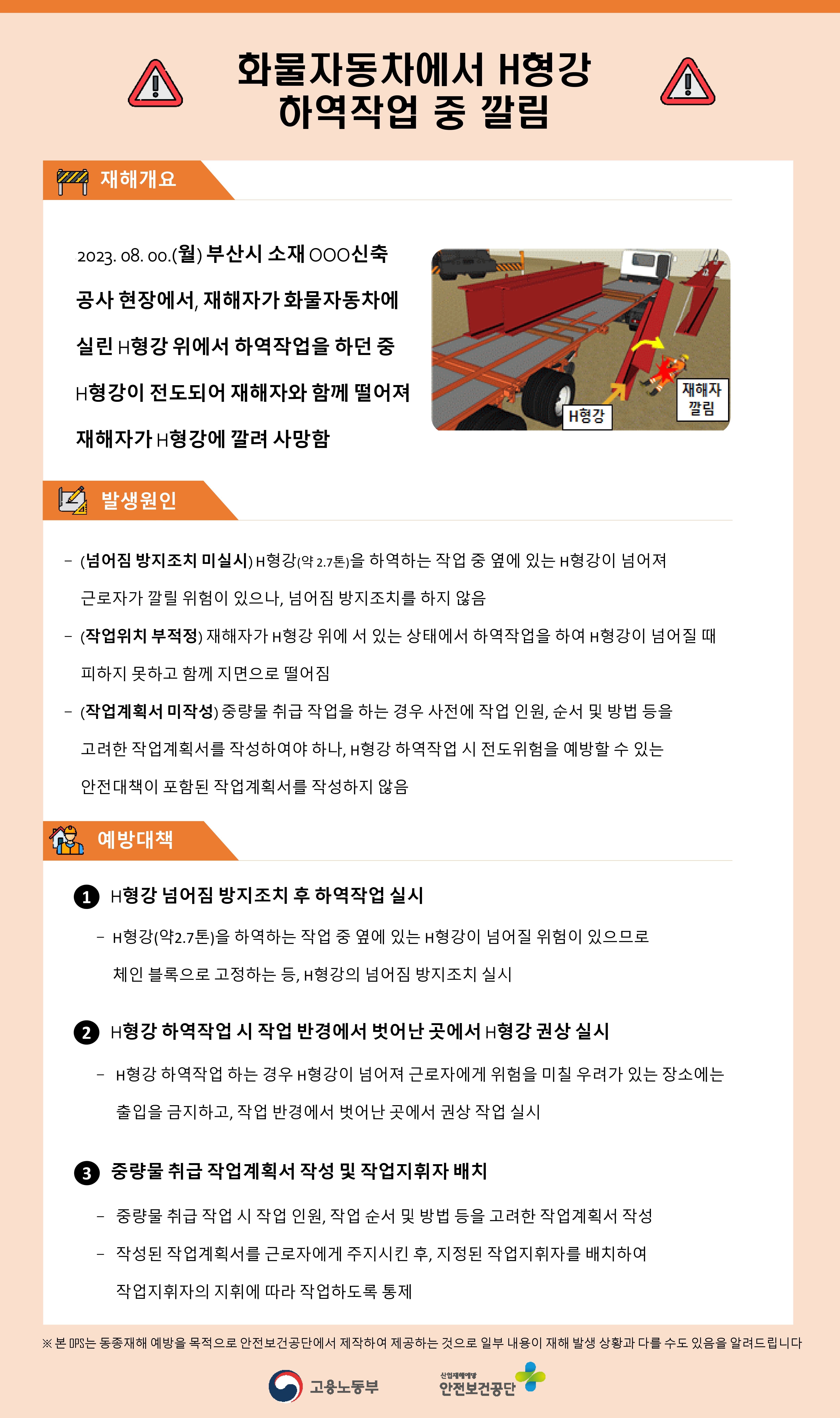 건설업 재해사례 - 화물자동차에서 H형강 하역작업 중 깔림