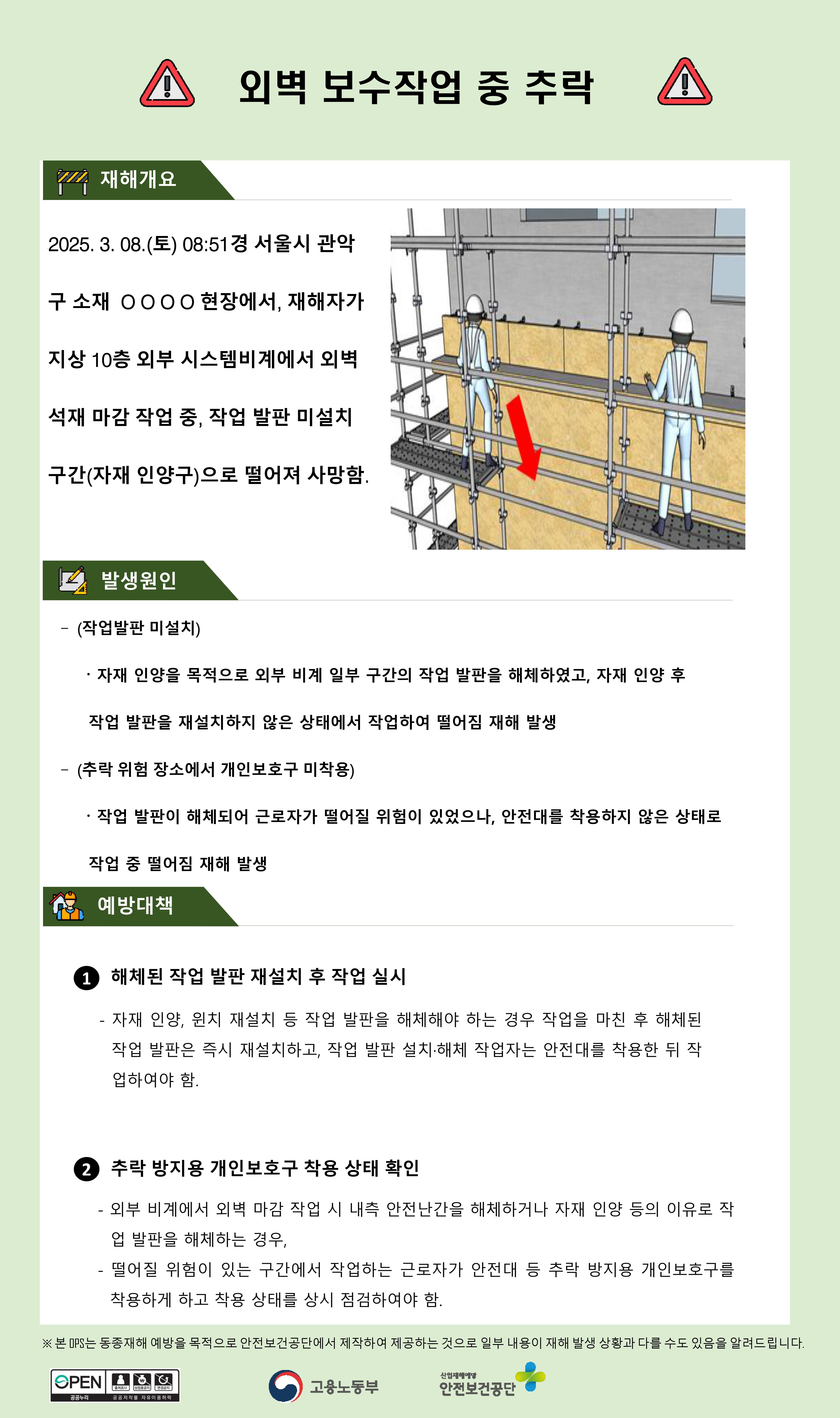 건설업 재해사례 - 외벽 보수 작업 중 추락