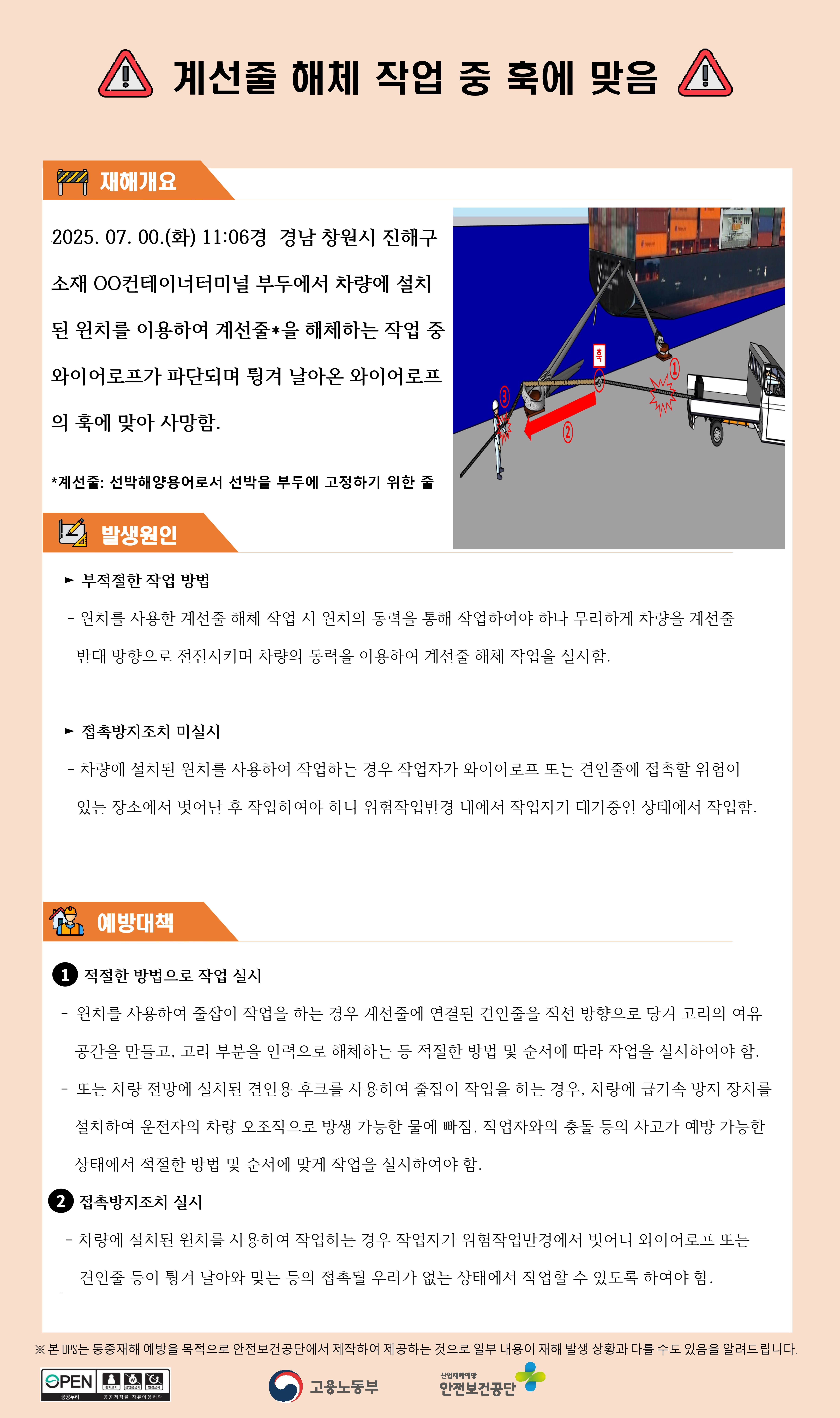 서비스업 재해사례 - 계선줄 해체 작업 중 훅에 맞음