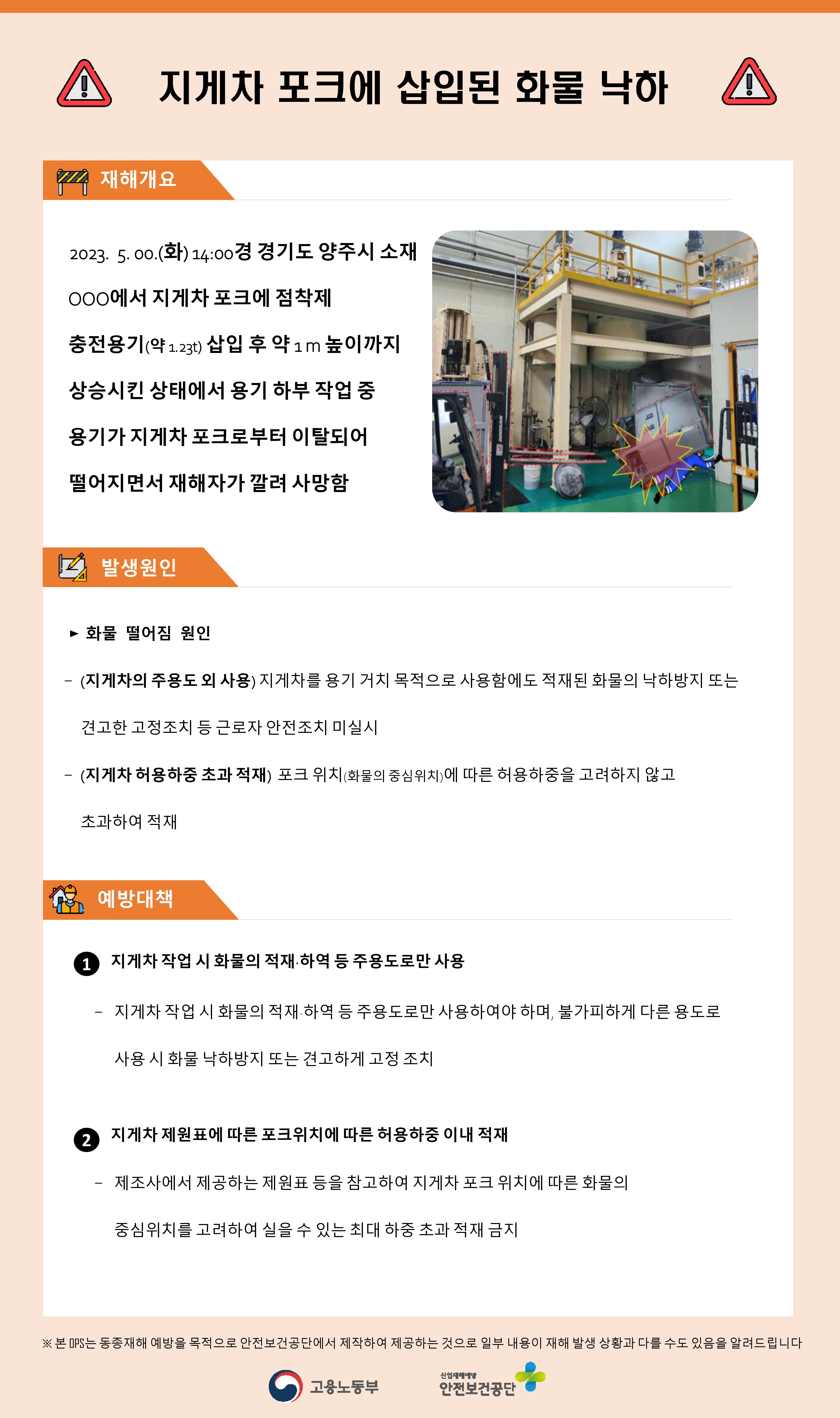 제조업 재해사례 - 지게차 포크에 삽입된 화물 낙하