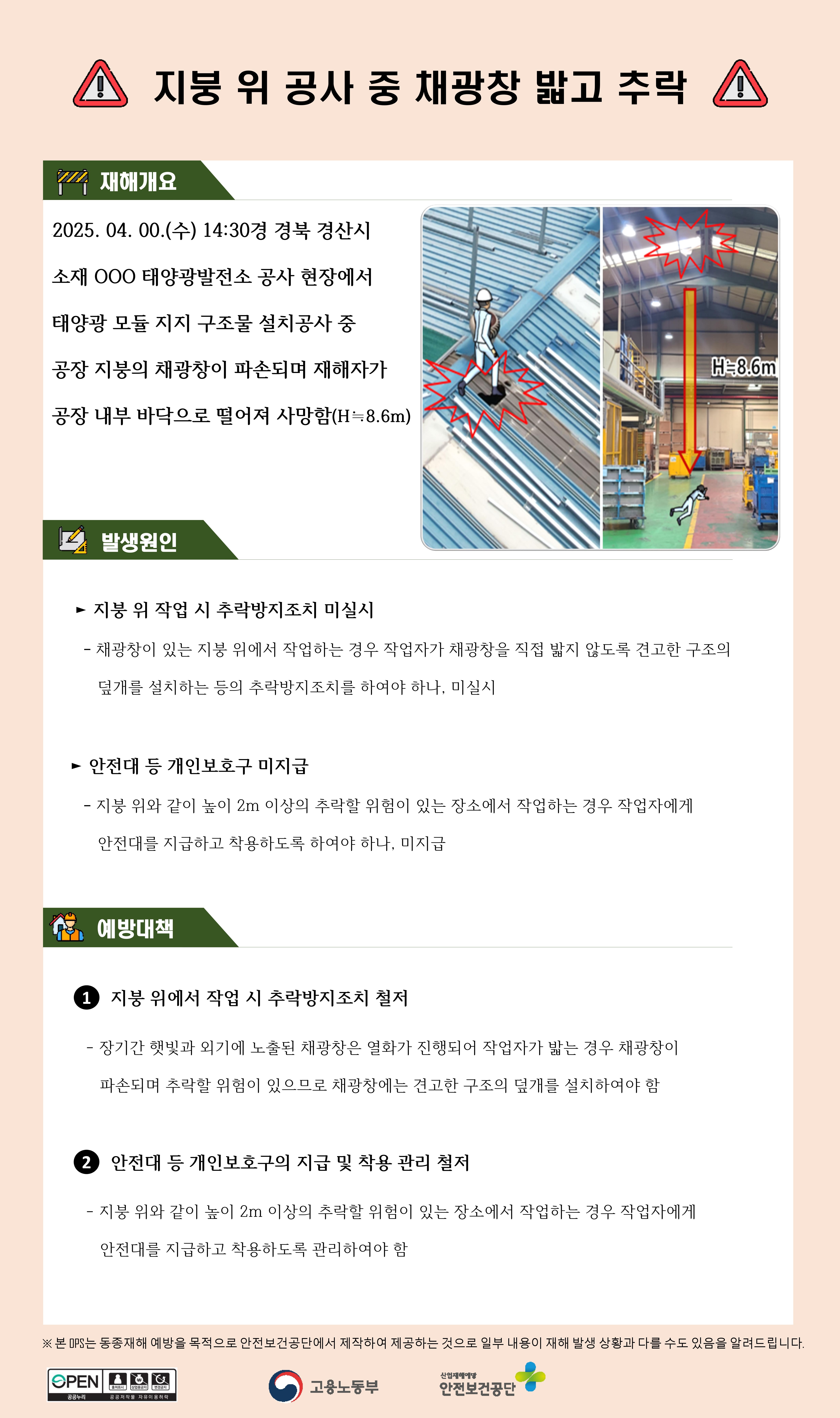 건설업 재해사례 - 지붕 위 공사 중 채광창 밟고 추락