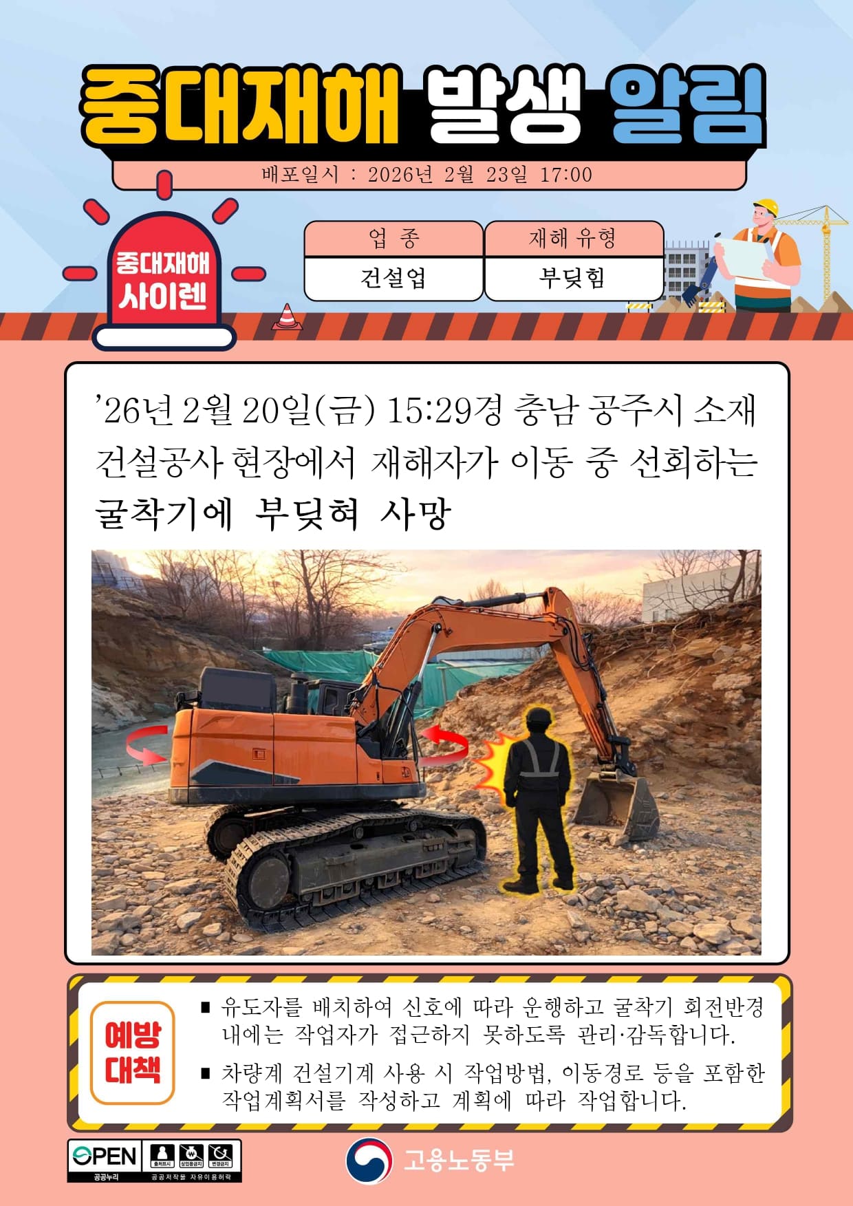 중대재해 발생 알림(부딪힘) - 건설업