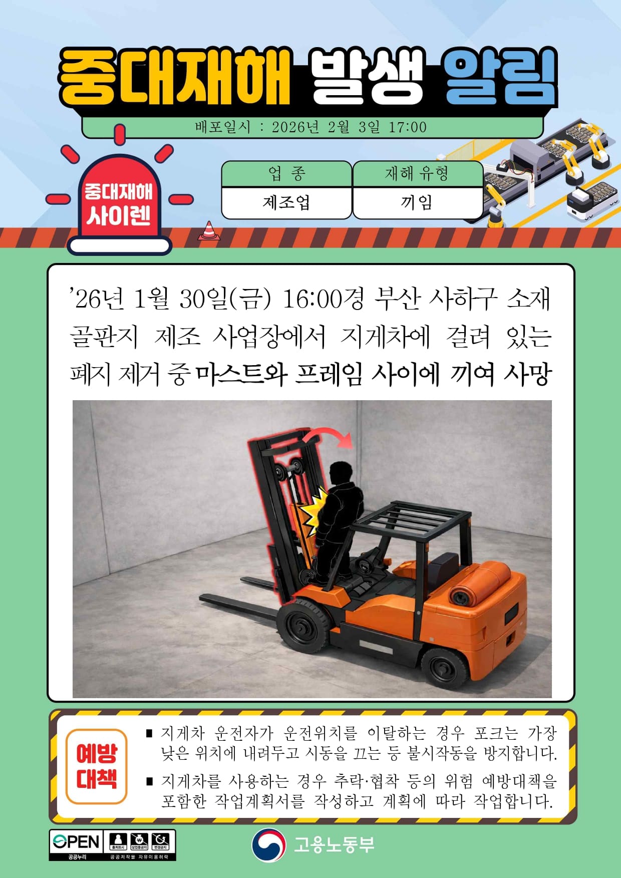 중대재해 발생 알림(끼임) - 제조업